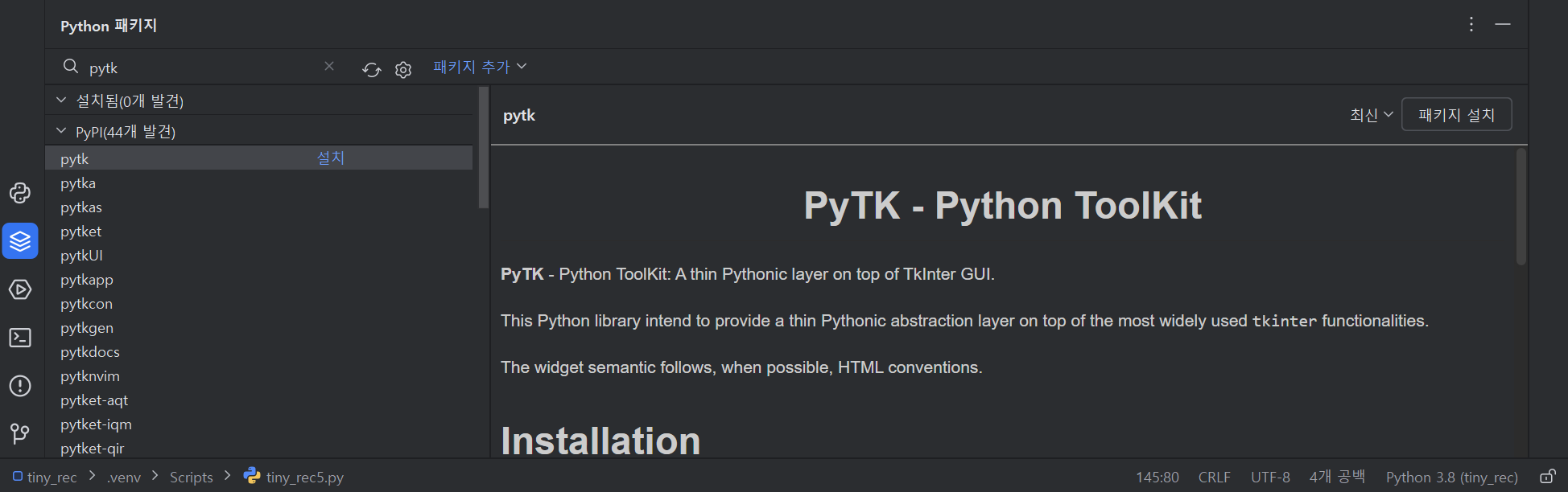 pycharm 좌측 하단부에 있는 "python package"를 선택하고, 검색란에 "pytk"를 입력하면 다음과 같이 설치할 모듈 옆에 "설치" 라는 링크가 표시된다(미 설치일 경우). 링크를 클릭해서 설치한다.